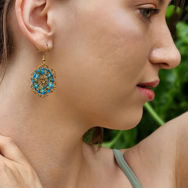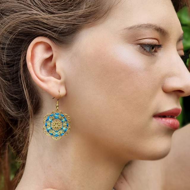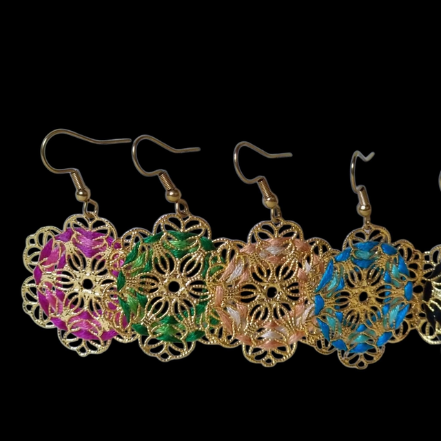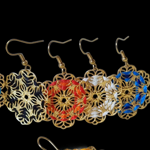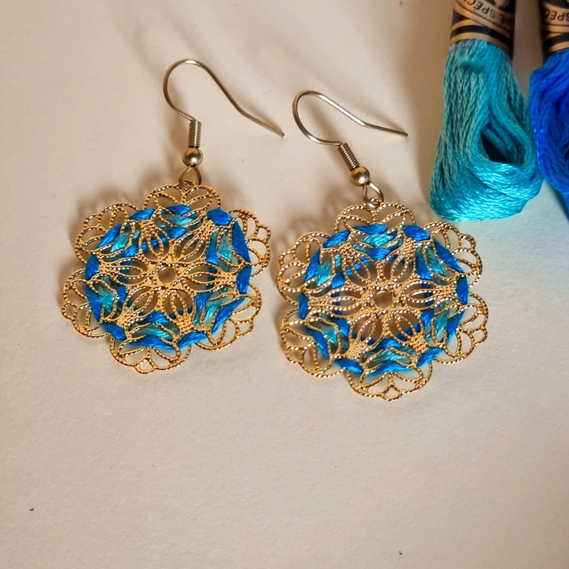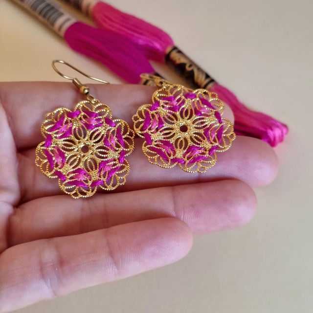 Boucles d'oreilles Flora brodées main en fil de coton sur structure filigrane en acier inoxydable doré. Fleurs délicates.