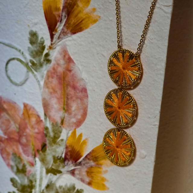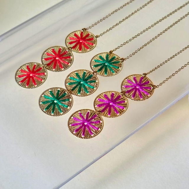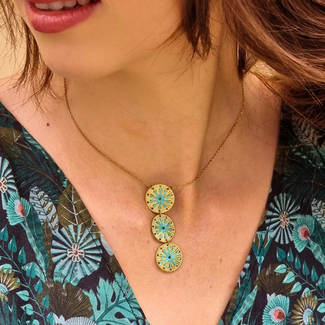 Le collier Stella Cascade évoque une pluie d'étoiles filantes descendant gracieusement le long de votre décolleté. Trois pièces circulaires brodées, aux rayons lumineux sont disposées en cascade élégante sur une chaîne fine, créant un mouvement céleste captivant qui capture la magie des nuits étoilées.